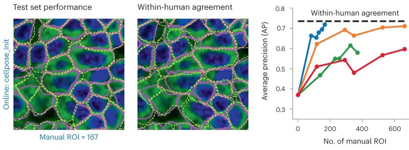 Except it doesn’t. Not necessarily. When we initialize with Cellpose 1.0, a new model can be trained with ~500 segmented ROIs. The gains beyond that are minimal.